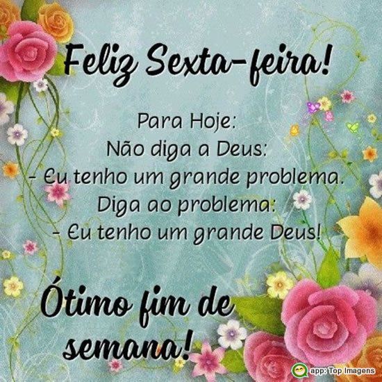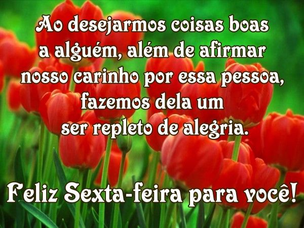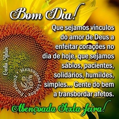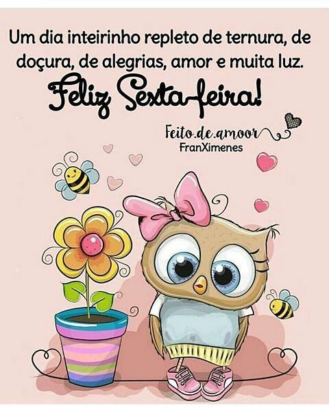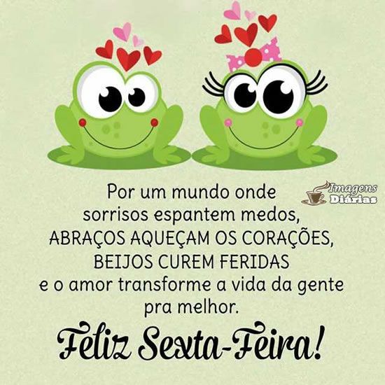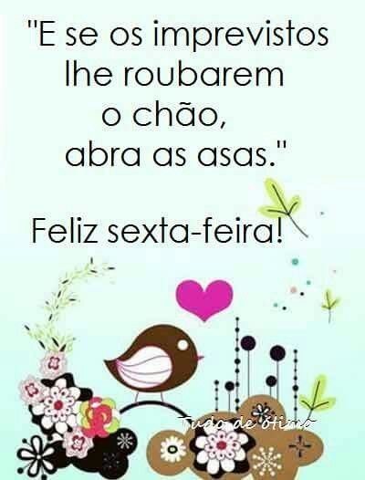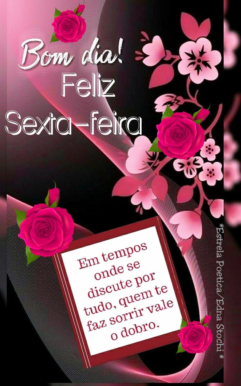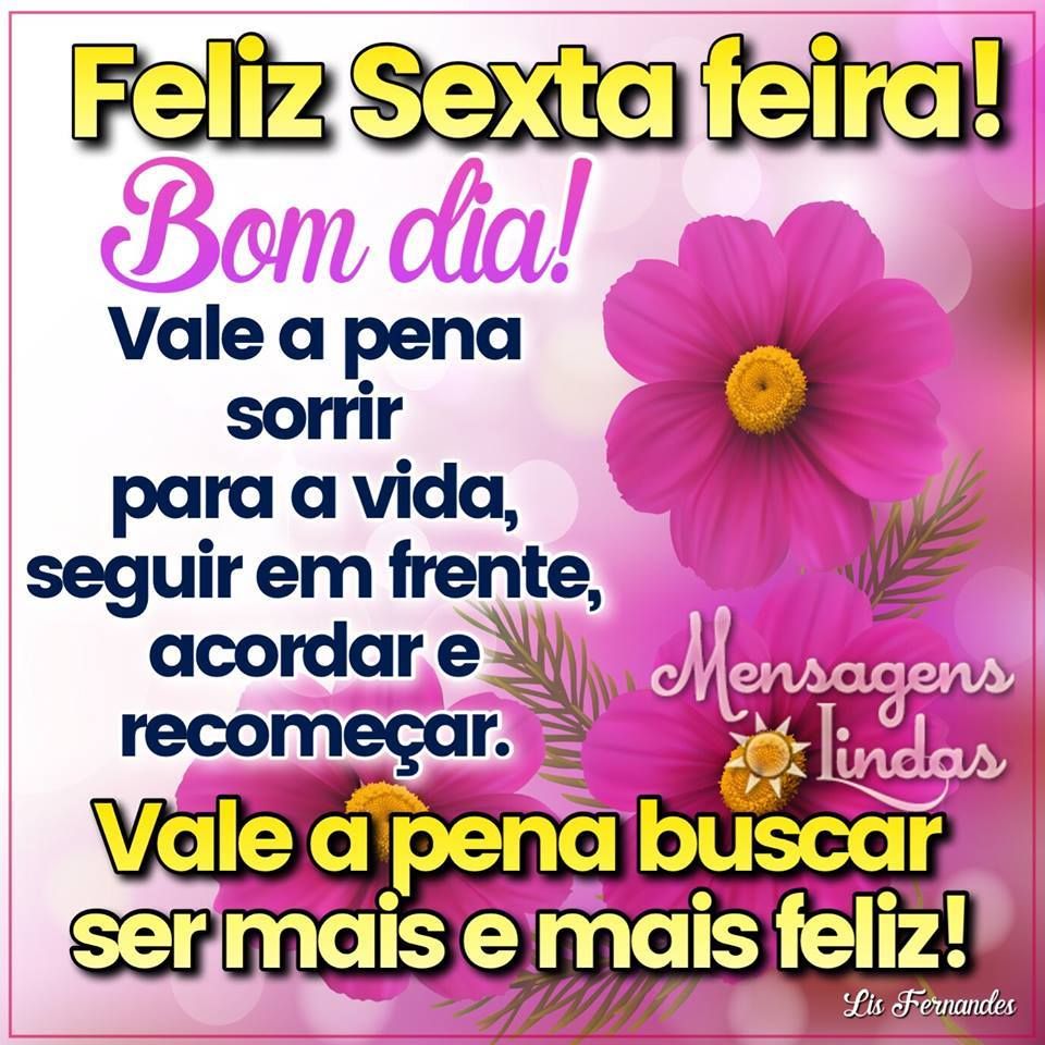 Feliz sexta-feira! Comece o dia alegrando o sorriso de alguém com um bom dia; assim tudo o que desejares retornará para ti.