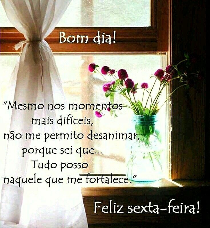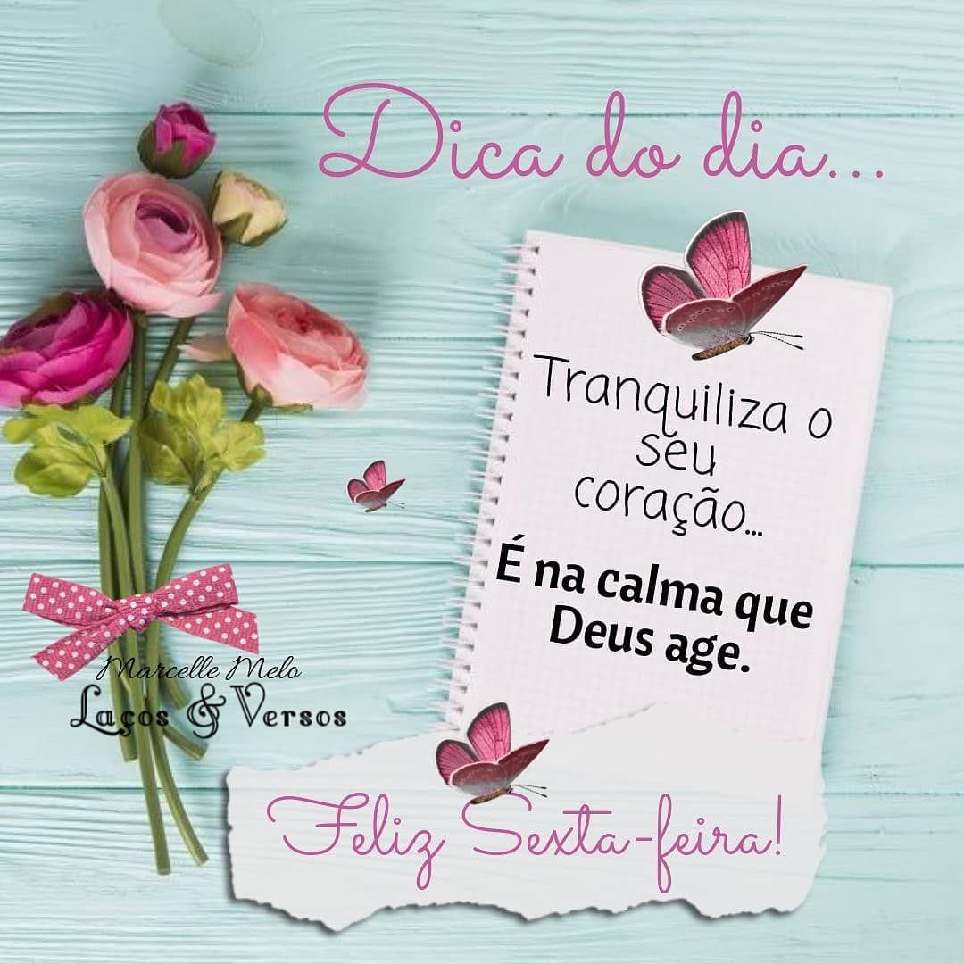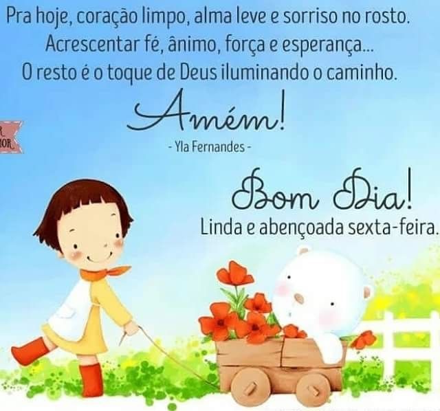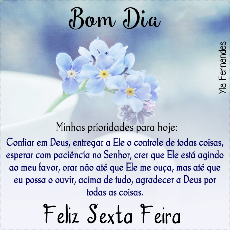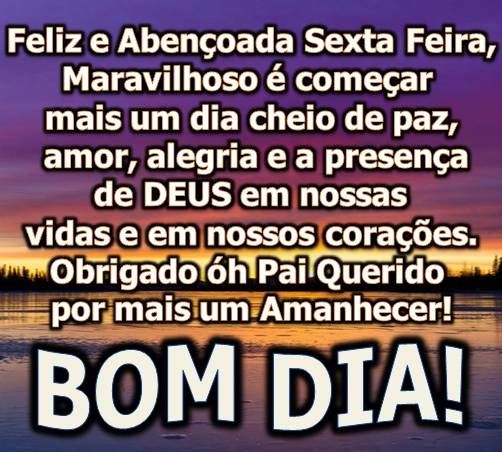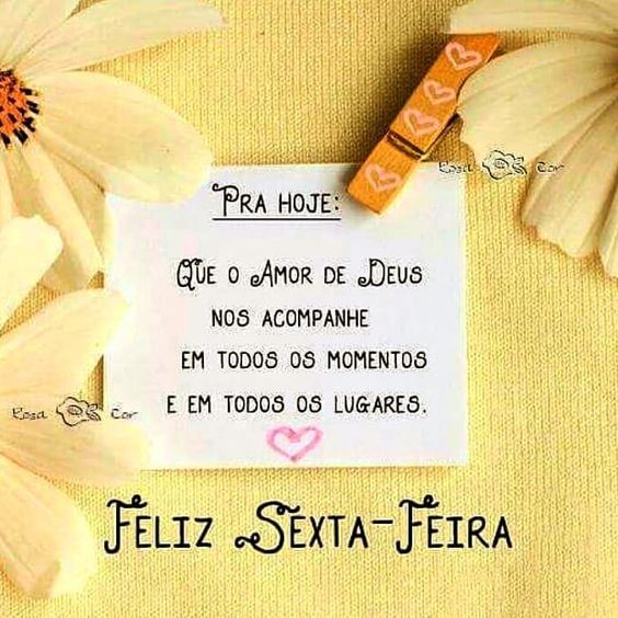 Feliz sexta-feira! Que possamos ter um dia abençoado e maravilhoso, repleto de muito amor e alegria; e que a presença de Deus nos envolva trazendo a paz para o nosso coração.