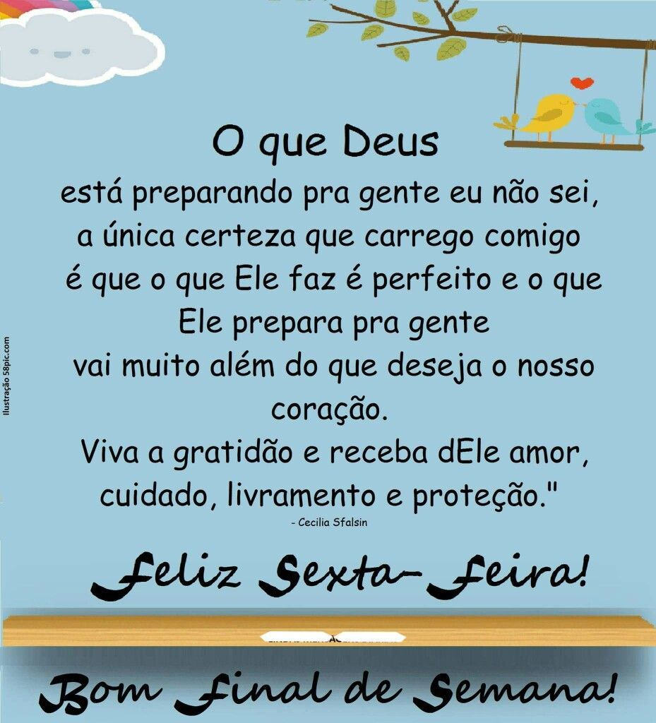 Feliz sexta-feira! E que estejamos sob a proteção e os cuidados de Deus… Para que assim o nosso dia venha ser de paz e tranquilidade.