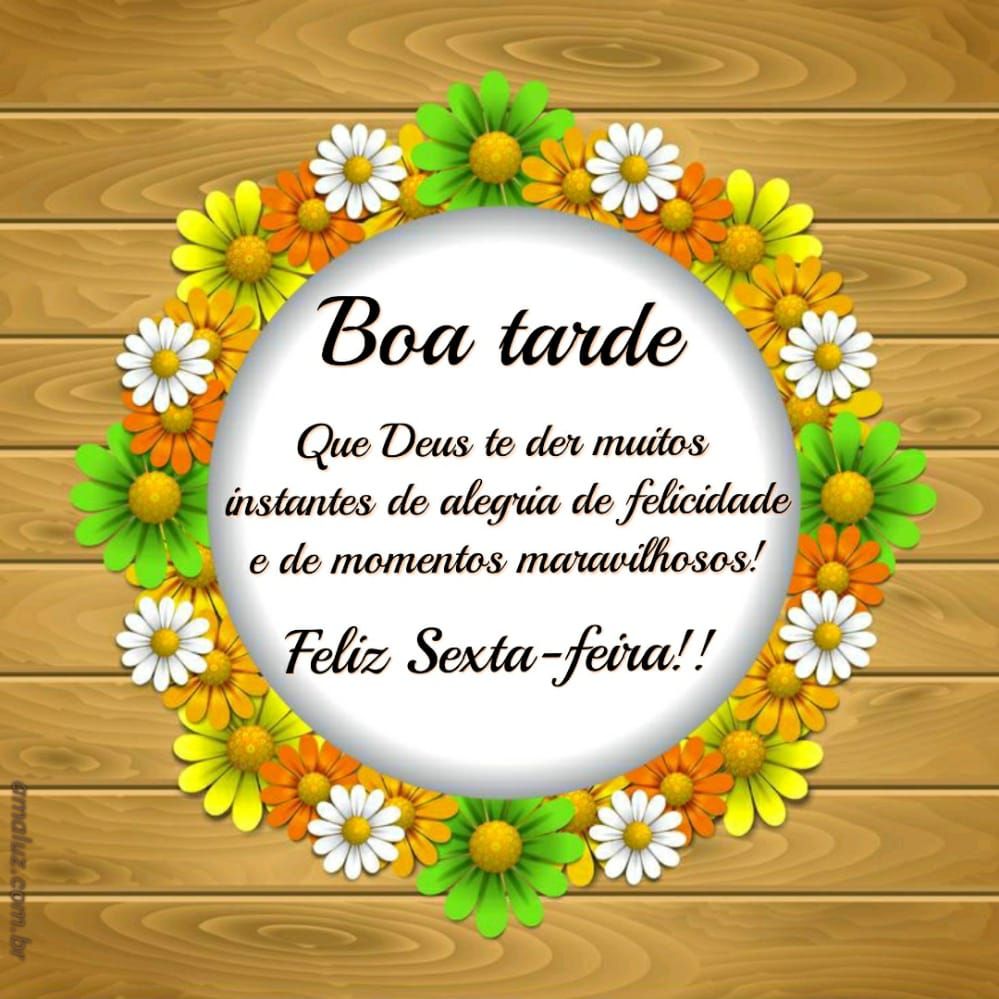 Boa tarde ! Te desejo uma tarde maravilhosa de sexta feira, que as bençãos de Deus desça sobre sua vida enchendo seu coração de alegria e sua vida de paz! Feliz sexta feira!