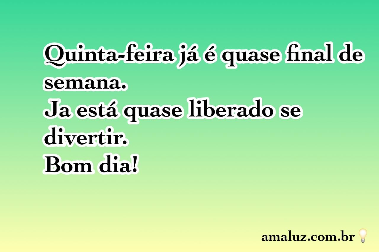 No dia de hoje desejo a você uma quinta-feira com muito amor e carinho, para que você aproveite bem o dia. Bom dia!