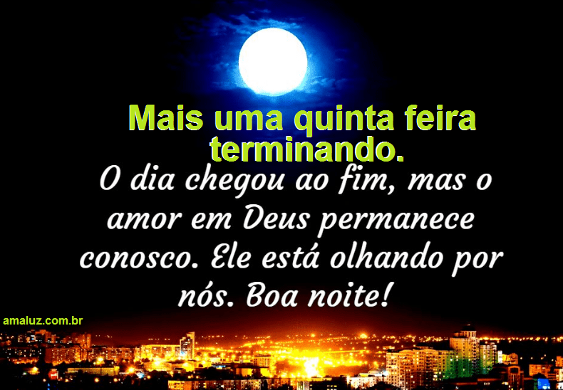 Boa noite quinta-feira com paz, amor e bênção! Quinta-feira acabando, e nada melhor que desejar um boa noite recheado de coisas boas para todos aqueles que são especiais na sua vida. Pois mais um dia se encerra, para que o novo possa se iniciar… E que venha com muitas bênçãos e lindas surpresas para mim e para você.