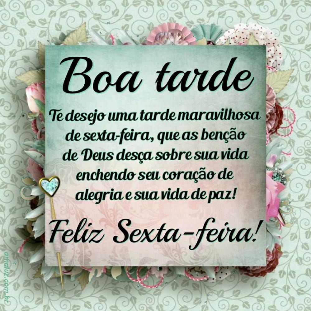 Boa tarde ! Te desejo uma tarde maravilhosa de sexta feira, que as bençãos de Deus desça sobre sua vida enchendo seu coração de alegria e sua vida de paz! Feliz sexta feira!