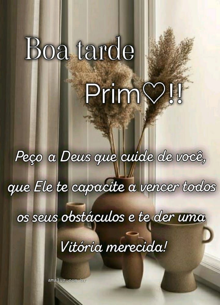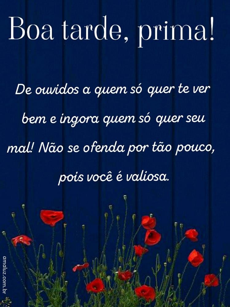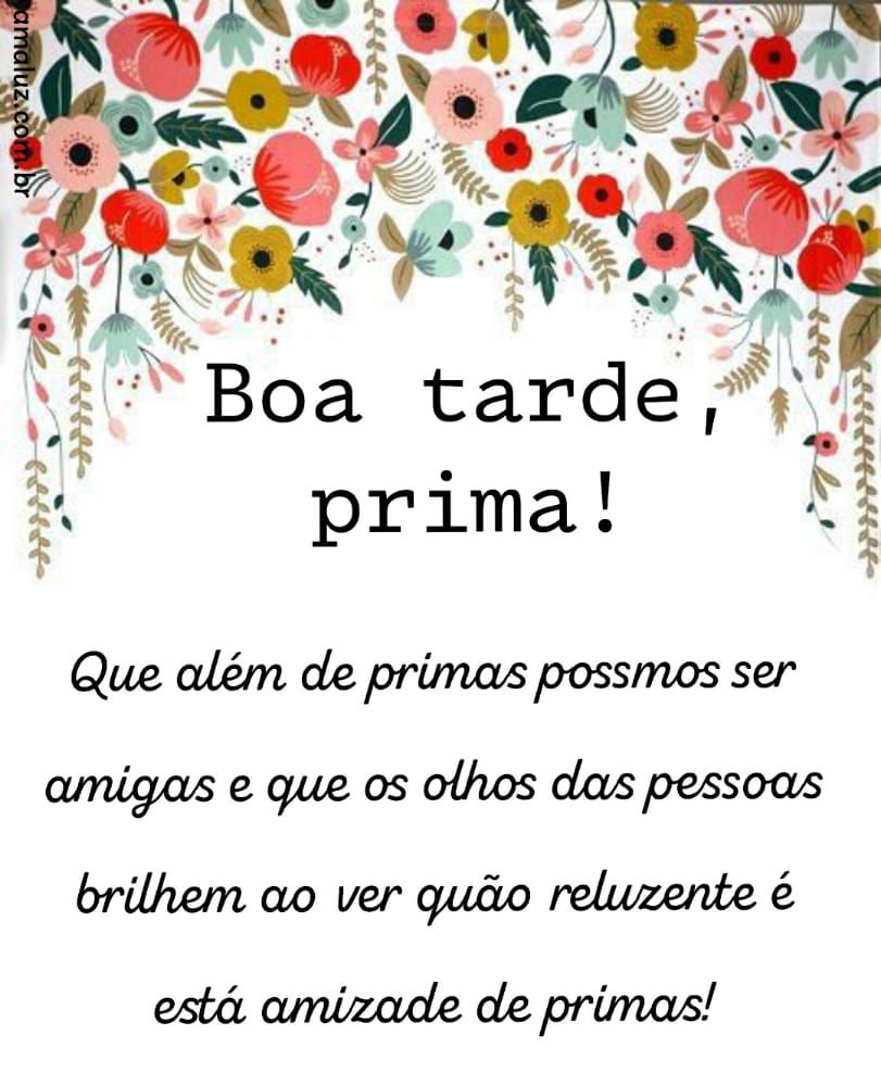 Tenha uma ótima tarde prima amada, que a felicidade seja contigo nesse finalzinho do dia e sempre! Boa tarde prima.