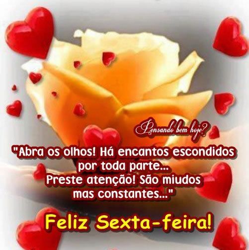 Olha que legal mais uma sexta feira chegou e vamos nós encantar com as coisas mais especiais que nós faz feliz, e minha maior felicidade é saber que vou desejar uma ótima sexta feira e um final de semana abençoado a todos! Assim possamos nos conectar e sentir a paz e o carinho de quem mais amamos…